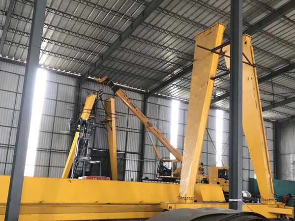 門(mén)式起重機(jī)(又稱龍門(mén)起重機(jī))是橋架通過(guò)兩側(cè)支腿支撐在地面軌道上的橋架型起重機(jī)。在結(jié)構(gòu)上由門(mén)架、大車(chē)運(yùn)行機(jī)構(gòu)、起重小車(chē)和電氣部分等組成。有的門(mén)式起重機(jī)只在一側(cè)有支腿,另一側(cè)支撐在廠房或棧橋上運(yùn)行,稱作半門(mén)式起重機(jī)。門(mén)式起重機(jī)的門(mén)架上部橋架(含主梁和端梁)、支腿、下橫梁等部分構(gòu)成。為了擴(kuò)大起重機(jī)作業(yè)范圍,主梁可以向一側(cè)或兩側(cè)伸出支腿以外,形成懸臂。也可采用帶臂架的起重小車(chē),通過(guò)臂架的俯仰和旋轉(zhuǎn)擴(kuò)大起重機(jī)作業(yè)范圍。